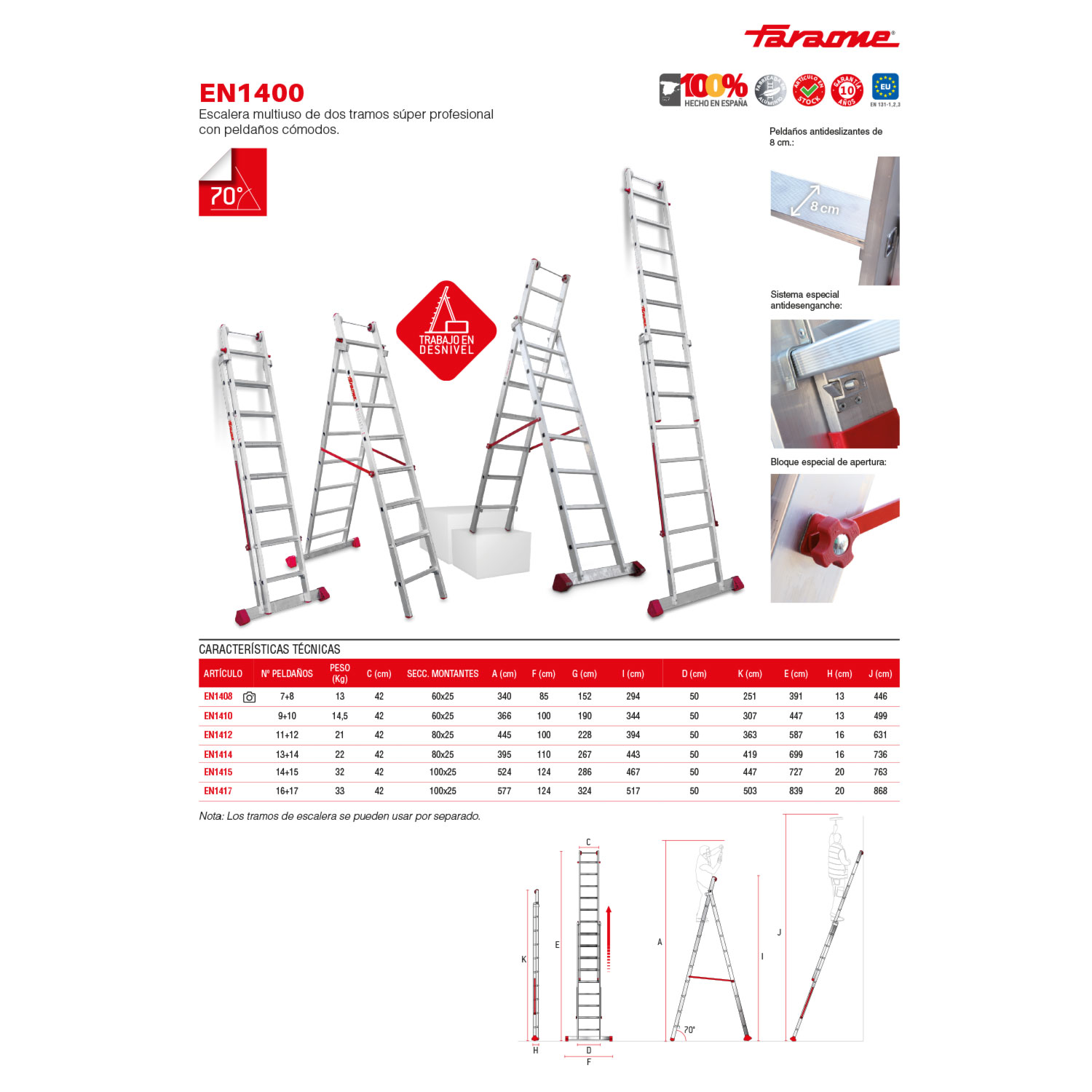 Dispone de 2 ruedas en la extremidad para facilitar la extensión a pared, bisagra robusta que permite de nivelar el tramo para trabajar en desnivel, un bloqueo de seguridad mediante un gancho con muelle práctico y seguro.