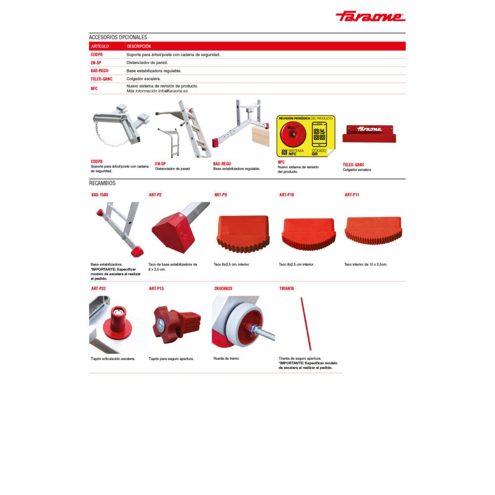 Dispone de 2 ruedas en la extremidad para facilitar la extensión a pared, bisagra robusta que permite de nivelar el tramo para trabajar en desnivel, un bloqueo de seguridad mediante un gancho con muelle práctico y seguro.